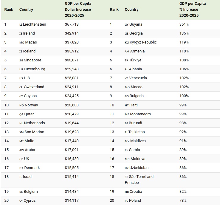 БДП по жител во Лихтенштајн порасна за 67.713 долари од 2020 година, што е најголем апсолутен пораст на глобално ниво. Гвајана забележа најголем процентен пораст на БДП по жител, достигнувајќи 351 отсто за пет години, поттикнат од брзорастечката нафтена индустрија