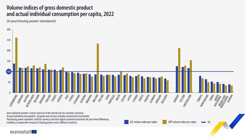 Луксембург е далеку од просекот на ЕУ во категоријата реална индивидуална потрошувачка бидејќи странските работници ги трошат своите приходи во матичните земји, објаснуваат статистичарите.