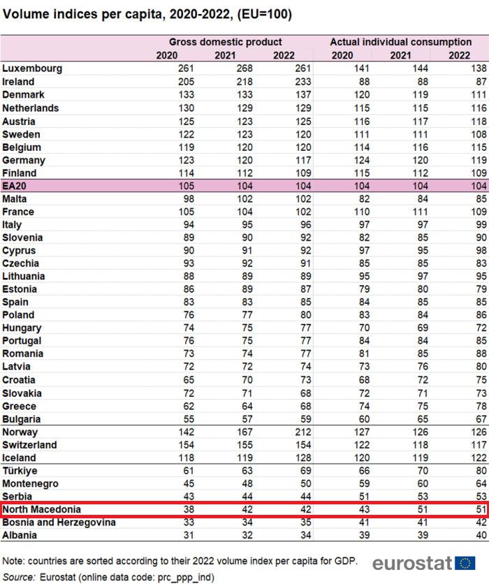 Стандардот на граѓаните во Македонија во 2022 година во однос на европскиот просек останал на исто ниво како и една година претходно, односно е на ниво од 51 отсто, покажуваат најновите податоци на Европското статистичко биро, Евростат. Полош сооднос во однос на европскиот просек имаат само Босна и Херцеговина и Албанија, а пред нас се Србија и Црна Гора. И натаму, најлош стандард од земјите членки на ЕУ имаат Бугарите, покажуваат податоците на Евростат.