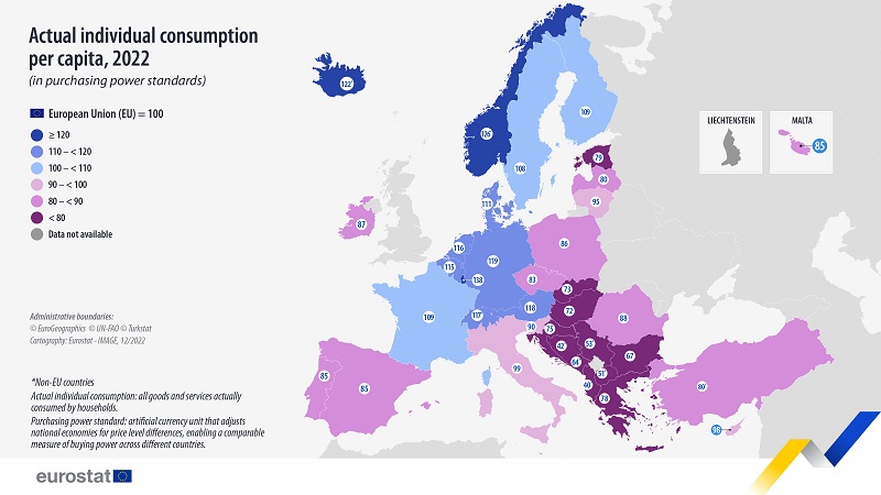 Евростат го мери стандардот според реалната, односно фактичката индивидуална потрошувачка по глава на жител (АИЦ) што покажува колку добра и услуги кои всушност потрошиле домаќинствата, без разлика дали се купени и платени од домаќинствата директно или од владата или од непрофитни организации. Фактичката индивидуална потрошувачка по глава на жител може да се смета како показател за материјалната благосостојба на домаќинствата. Во 2022 година, АИЦ по глава на жител изразена во стандардот за куповна моќ (ППС) варира од 67 отсто до 138 отсто од просекот на ЕУ во 27-те земји членки на ЕУ.