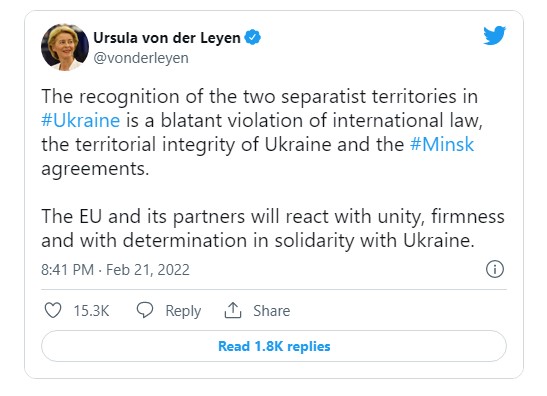 „Признавањето на двете сепаратистички територии во Украина е очигледно кршење на меѓународното право, територијалниот интегритет на Украина и договорите од Минск“, напиша претседателката на Европската комисија Урсула фон дер Лајен во твит.