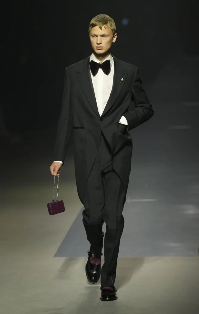 Фенди не е првиот што става бисери на мажите. Модната куќа исто така го продолжи трендот на мали чанти – заборавете го паричникот и најдете џеб за телефонот – кои мажите ги носеа на синџири.
