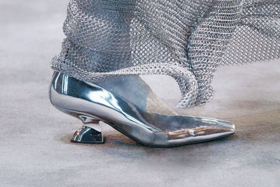 Како дизајнер на чевли, Ендру се погрижи неговиот концепт да се почувствува во обувките. Изборот на футуристички патики (што исто така се чинеше ретро, како визија од 90-тите како ќе изгледаат футуристички патики) даде спортски елемент на сè, додека металните чевли имаа ретро гламур (силуетата доаѓа од легендарната F -петица, на која дизајнерот се повикал неколку пати за време на неговото време во Ферагамо, вклучително и во колекцијата пролет ’21).(WWD)