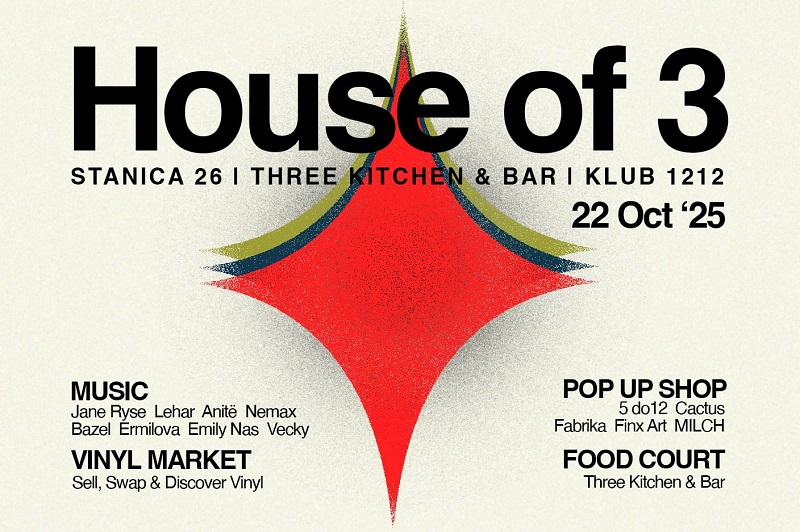 Утре (22 октомври) ќе се одржи дванаесетчасовен мултимедијален фестивал „Хаус оф Три“ (House of 3) на три сродни и препознатливи локации во центарот на Скопје — во „Три Кичен&Бар“ и во ноќните клубови „Клуб 1212“ и „Станица 26“.