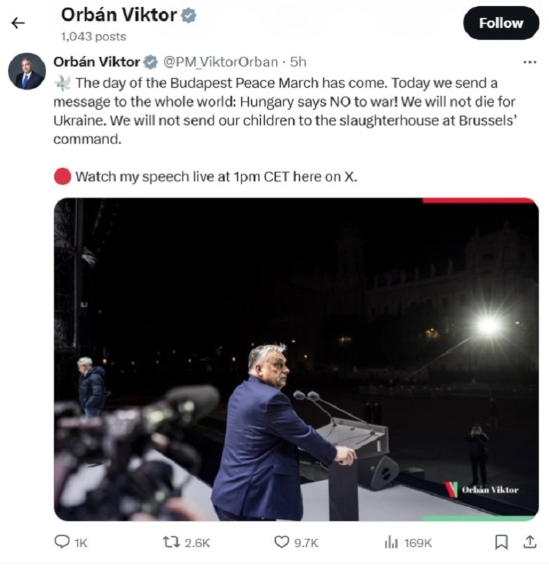 „Дојде денот за ’Маршот на мирот’ во Будимпешта. Денеска испраќаме порака до целиот свет: Унгарија вели НЕ на војната! Нема да гинеме за Украина. Нема да ги праќаме нашите деца во кланица по налог на Брисел“, рече Орбан пред митингот на мрежата X.