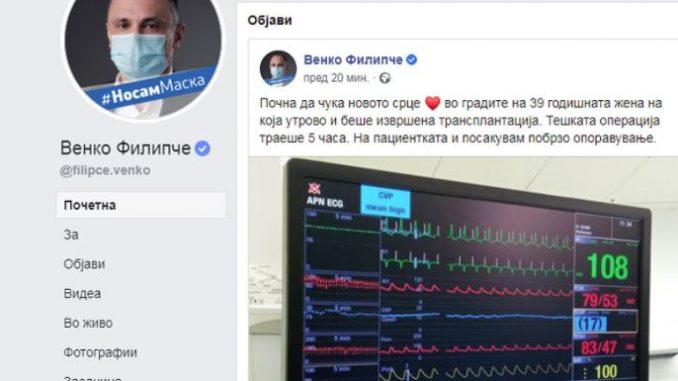 -Доцна синоќа заедно со моите колеги Националната координаторка за трансплантација доц. д-р Маја Мојсова Мијовска тимот кардиохирурзи проф. д-р Сашко Јовев, академик Жан Митрев, д-р Марјан Шокаровски, д-р Васил Папестиев, д-р Тања Анѓушева ги направивме подготовките за трансплантација на срце и бубрези од мртов донор чие семејство даде согласност да се донираат органите на пациентот. На тимовите лекари кои ќе ги вршат трансплантациите им посакувам многу успех. Да им држиме среќа, напиша Филипче во својот статус на Фејсбук.