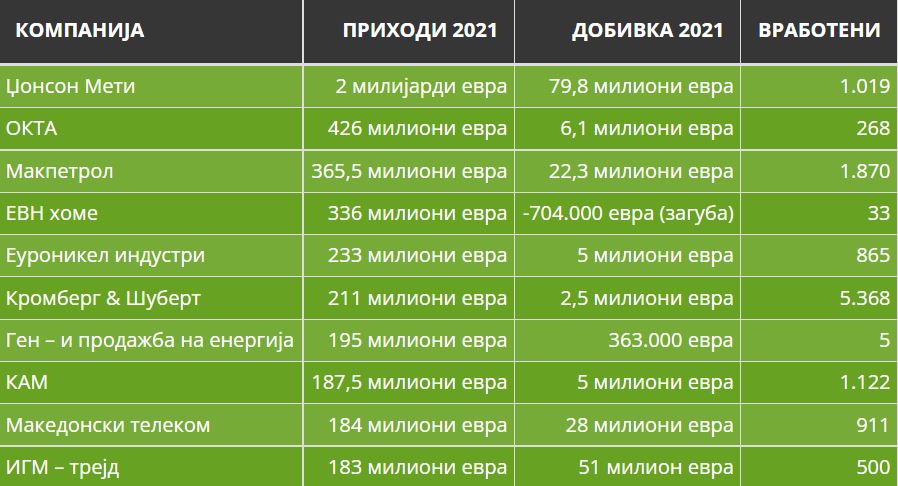 На второ место по приход е „Окта“. Компанијата која е трговец со нафтени деривати, лани направила промет од 426 милиони евра. Ова на компанијата и донело добивка од 6,1 милиони евра. Бизниот со деривати му донел на „Макпетрол“ трето место по приход. Во оваа компанија, граѓаните и фирмите оставиле 365,5 милиони евра, односно по 1 милион евра дневно, и ова довело до добивка од 22,3 милиони евра. Бизнисот со струја пак, на компанијата која е универзален снабдувач, односно преку која со струја се снабдуваат сите домаќинства и околу 60.000 компании кои се на регулираниот пазар, на ЕВН хоум и донел загуба од 704.000 евра, иако компанијата остварила промет од 336 милиони евра. На 9-то место по приход е компанијата од телекомуникацискиот сектор – Македонски телеком со приход од 184 милиони евра и добивка од 28 милиони евра.