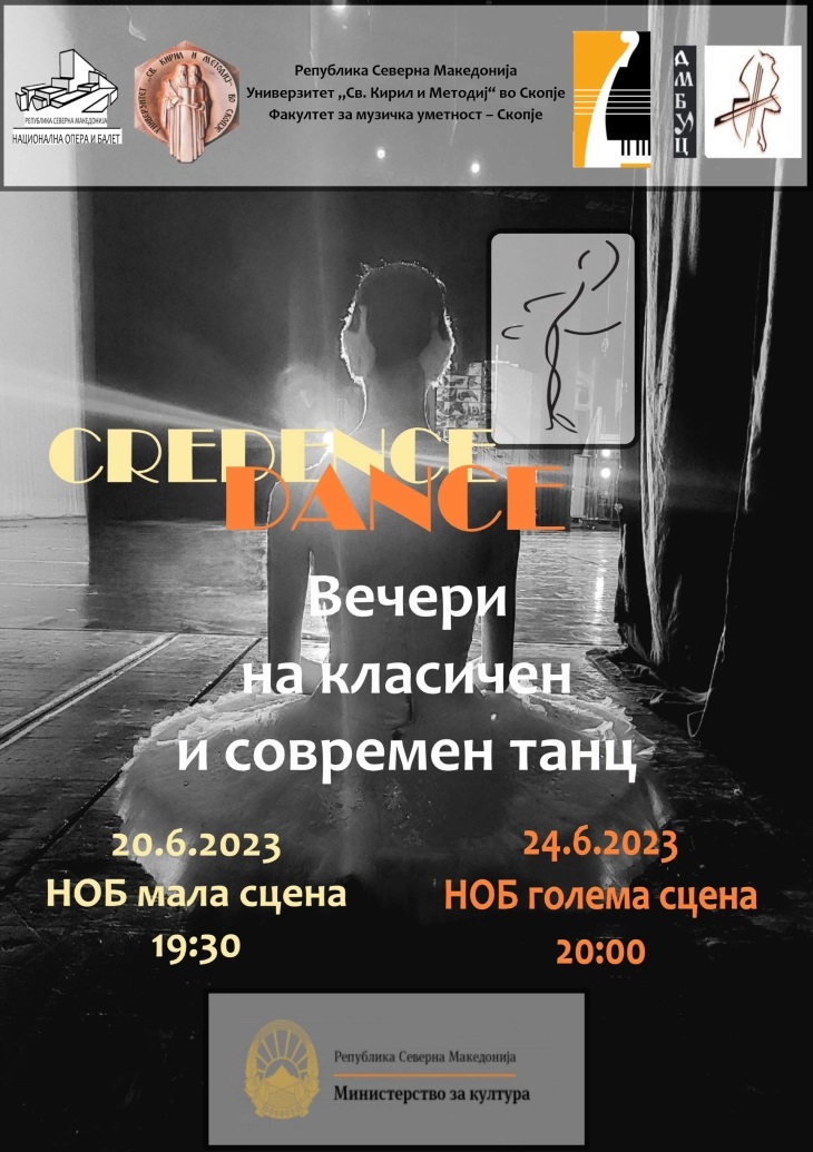 На малата сцена на Нацоналната опера и балет вечер од 19.30 часот ќе биде презентиран современиот танц од студентите на ФМУ со учество на учениците од ДМБУЦ „Илија Николовски Луј“. Ексклузивен гостин на вечерта е поранешниот студент на ФМУ, Бојан Мицев, и неговата партнерка Амбре Твардовски со која се дел од Оснабрук танцовата компанија во Германија.