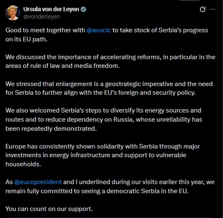 „Нагласивме дека проширувањето е геостратешки императив, како и потребата Србија повеќе да се усогласи со надворешната и безбедносната политика на ЕУ. Исто така, ги поздравивме чекорите на Србија за диверзификација на изворите и рутите за снабдување со енергенси и за намалување на зависноста од Русија, чија несигурност е постојано демонстрирана“, објавија Фон дер Лајен и Кошта.