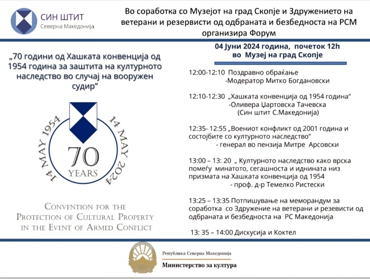 Во ЈУ Музеј на град Скопје денеска ќе се оддржи Форум насловен како „70 години од Хашката конвенција од 1954 година“ во организација на Македонскиот национален комитет на Синиот штит, а во соработка со Музејот на град Скопје и Здружението на ветерани и резервисти од одбраната и безбедноста на Република Северна Македонија.