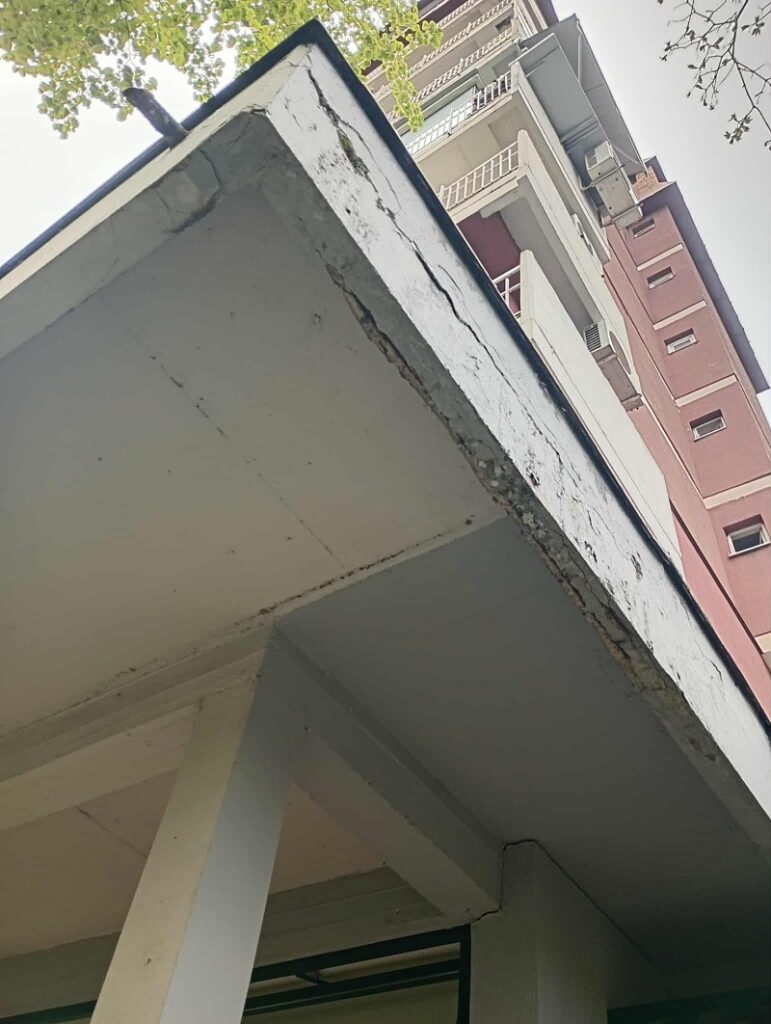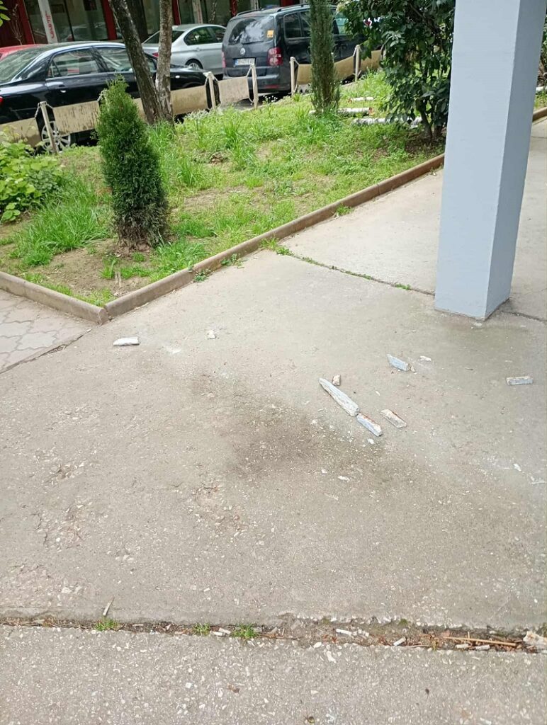 Долги делови од фасада, дебели околу 10-тина сантиметри се паднати по бетонската патека која ја окружува зградата, а која е фреквентна преку ден, со оглед на тоа дека во овие неколку згради сместени се банки, а во близина е и трговскиот центар „Беверли хилс“, како и повеќе маркети.