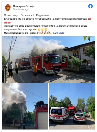 -Благодарение на брзата интервенција на противпожарната бригада. Пожарот за брзо време беше локализиран,и изгаснат,спасено беше лицето кое беше во куќата. Нема повредени во настанот, велат од Пожарната Скопје.