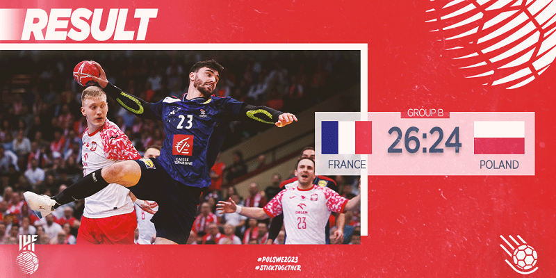 Во премиерниот натпревар на Светското ракометно првенство репрезентацијата на Франција вечерва во рамки на групата Б во Катовице со 26-24 (14-13) ја совлада Полска, која заедно со Шведска е домаќин на завршниот турнир.