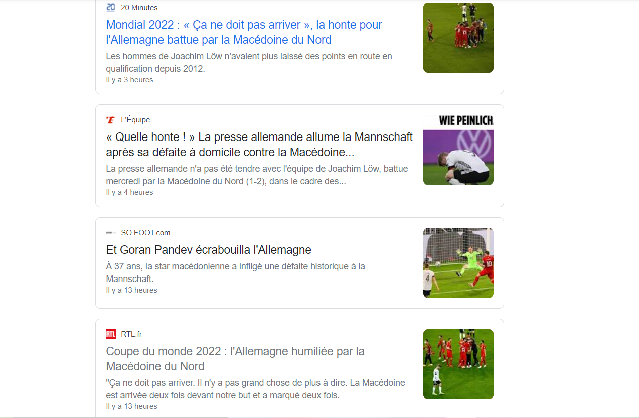 Француското издание „20 Минути“ објави текст под наслов „Тоа не требаше да се случи – срам за Германија, победена од Северна Македонија“, потсетувајќи дека досега германската репрезентација немаше изгубено бодови во квалификации за Светско првенство од 2012 година.
