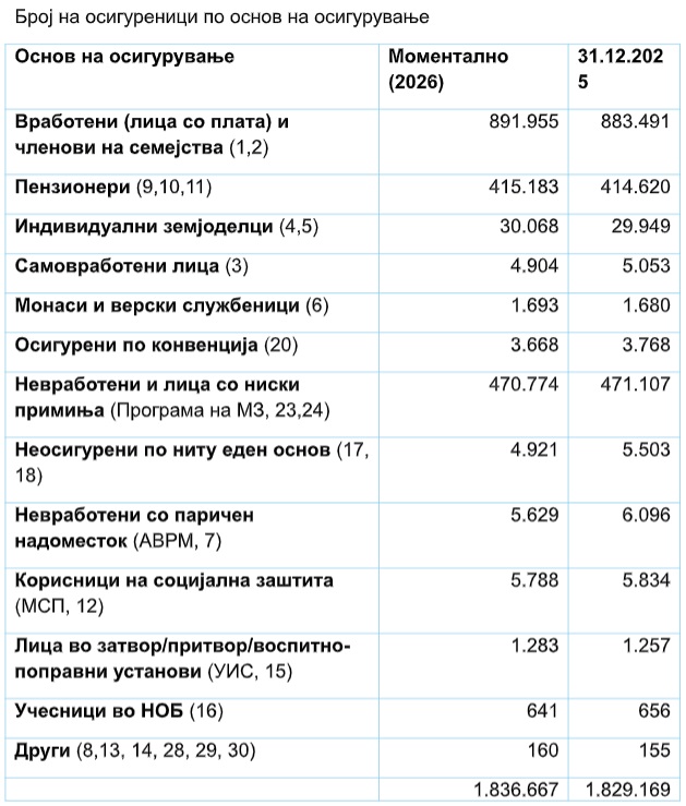 Во моментов во Македонија има 1.836.667 осигуреници, од кои 470.774 осигуреници или