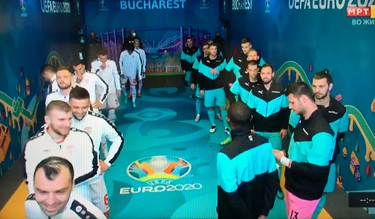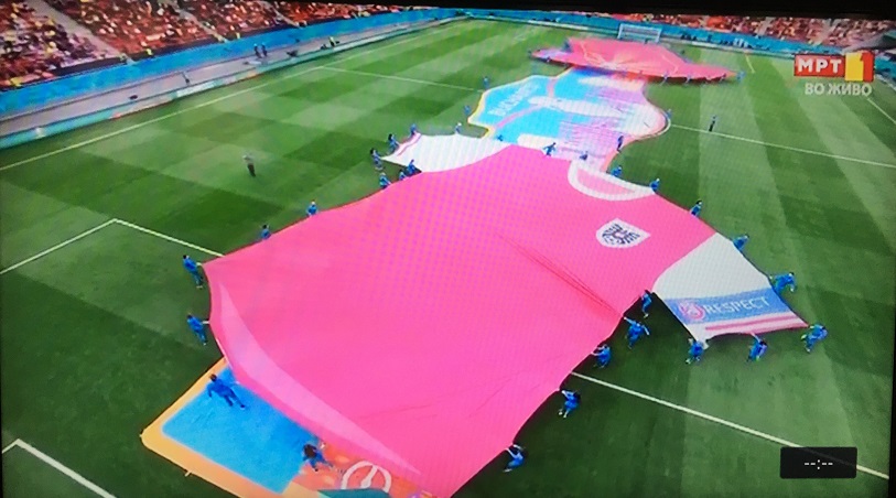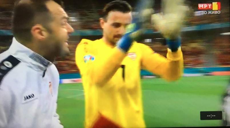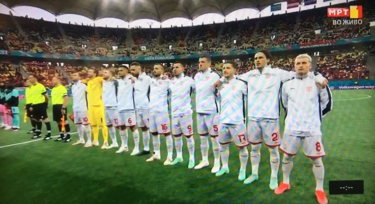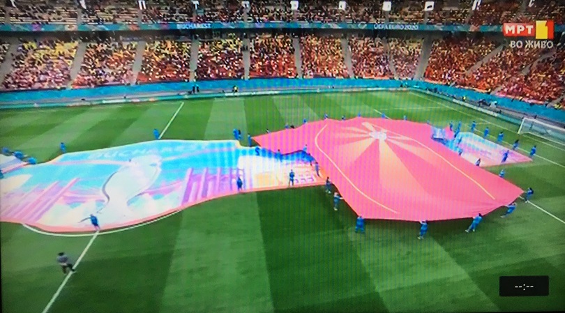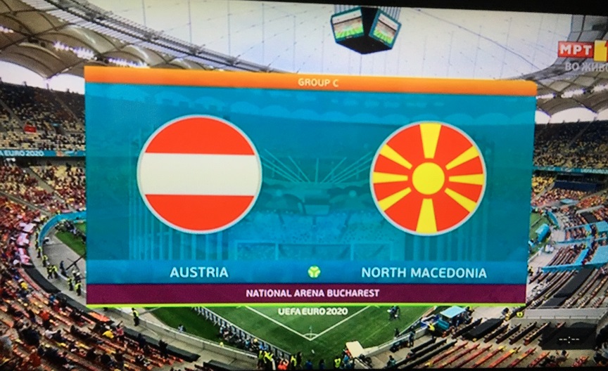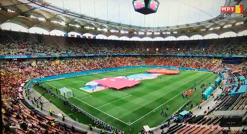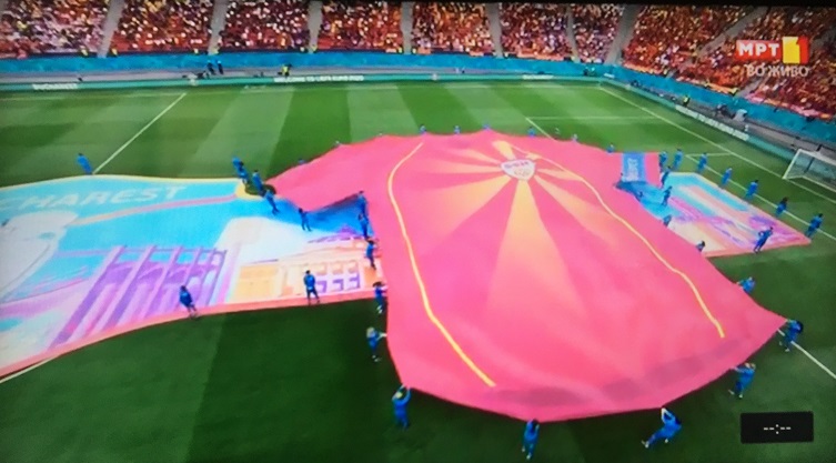 Одлична атмосфера на почетокот на фудбалскиот натпревар помеѓу Македонија и Австрија во главниот град на Романија, Букурешт, каде што Националната арена беше обоена во црвано жолто.