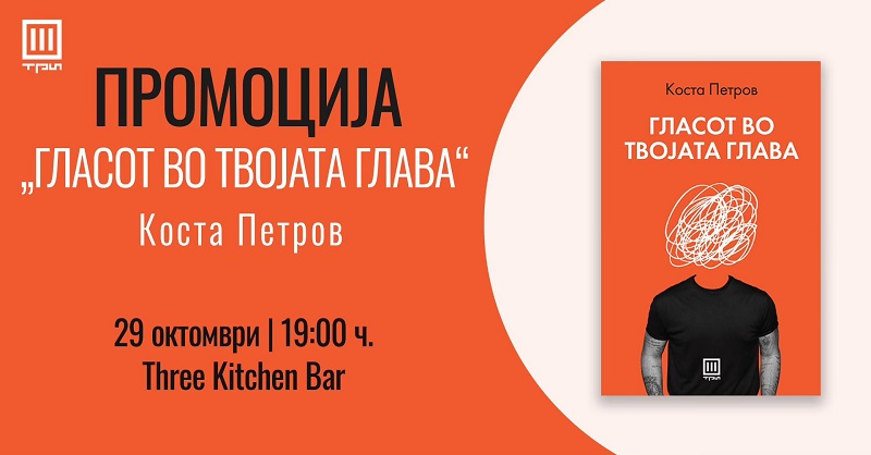 Вечерва (29 октомври), во Three Kitchen Bar, од 19 ч., ќе се одржи промоција на новата книга на Коста Петров, „Гласот во твојата глава“, во издание на Издавачки центар ТРИ.