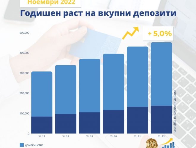 Годишен раст од 5,0% на вкупните депозити и од 9,6% на вкупната кредитна поддршка во ноември 2022 година.