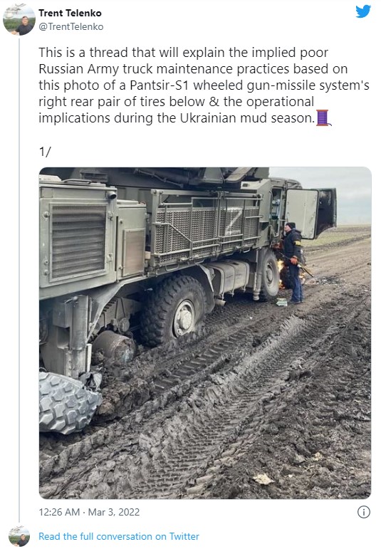 Трент Теленко, поранешен вработен во Агенцијата за управување со договори за одбрана на САД, на својот профил на Твитер ги истакна проблемите што настанаа кога руските борбени возила се соочија со пукнатина – пролетно затоплување што ја претвора украинската почва во кал во средината на март.