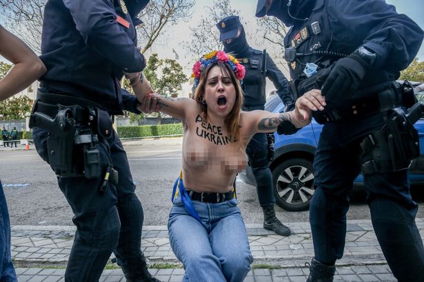 Со голи гради во боите на Украина, мавтајќи со жолти и сини чадни бомби и транспаренти, феминистките извикуваа „солидарност со Украина“, повикувајќи ја Европската унија да ја направи оваа земја „28-ма“ земја членка.