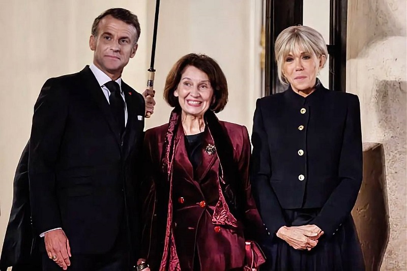 На вечерата со претседателот Емануел Макрон и првата дама, Брижит Макрон, избра кадифен комплет во иста, бордо нијанса, со шамија и брош и соодветни свечени салонки. Ако бараме влакно во јајцето, би избрале тенки хулахопки во нјуд нијанса отколку црни, иако визуелно црните не се лош избор, ама даваат погруб тон на целата силуета.