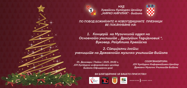 На 5 декември во петок, од 19 часот, во свечената сала на Културно информативниот центар Битола, Македонско-хрватското друштво и Хрватскиот културен центар “Марко Марулиќ”, организираат Божиќен и предновогодишен концерт, кој овoј центар традиционално го организира секоја година на радост на љубителите на хрватската култура во Битола.