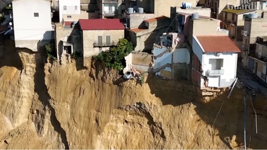 Градоначалникот на град на врвот на ридот на Сицилија рече дека „ситуацијата е катастрофална“ откако силна бура сруши долг дел од ридот, оставајќи куќи опасно сместени на работ на карпата.