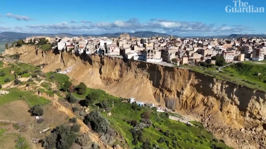 Градоначалникот на град на врвот на ридот на Сицилија рече дека „ситуацијата е катастрофална“ откако силна бура сруши долг дел од ридот, оставајќи куќи опасно сместени на работ на карпата.