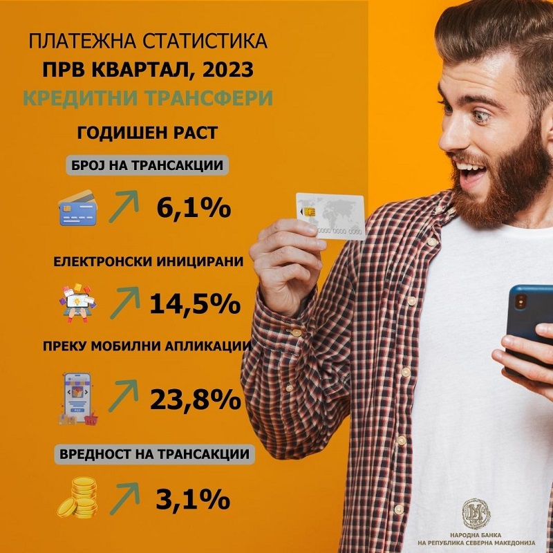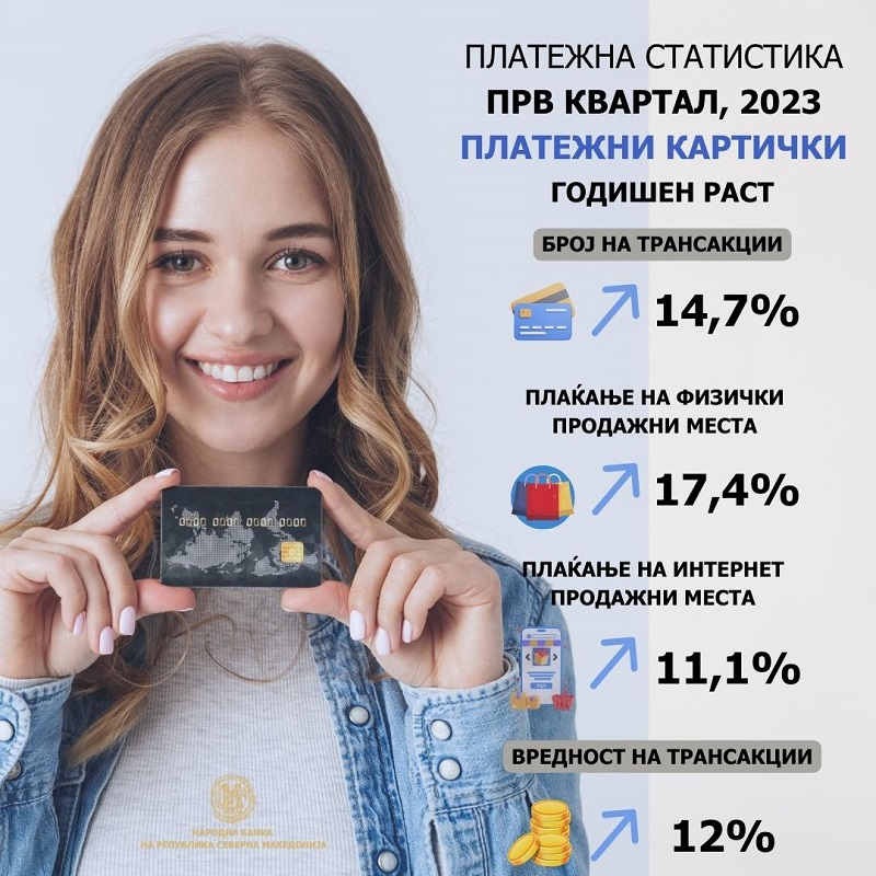 Имено, во првиот квартал од 2023 година, годишниот раст на употребата на платежни картички издадени во земјата за готовински трансакции и за плаќање производи и услуги во земјата од страна на граѓаните изнесува 14,7% кај бројот и солидни 12% кај вредноста на овие трансакции. Притоа, значителен годишен раст од 16,8% е забележан кај употребата на картичките за плаќање производи и услуги во земјата, при засилен раст на плаќањата на физичките места на продажба од 17,4%, но и солиден
