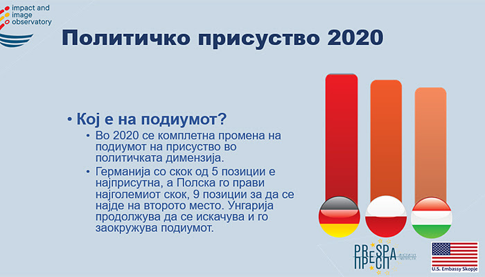 Институтот Преспа наведува дека во однос на политичкото присуство, подиумот за 2020 година го сочинуваат – Германија, Полска и Унгарија. Притоа, двете највисоко рангирани држави прават сериозен скок за да го окупираат врвот. Германија бележи скок од пет позиции, додека Полска прави скок од девет позиции.