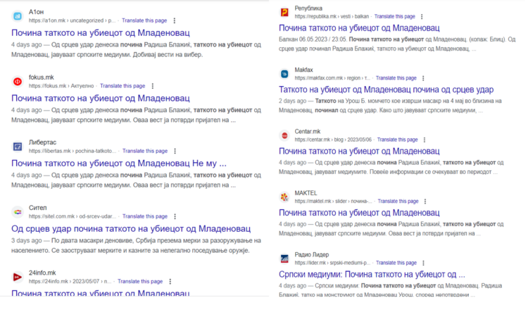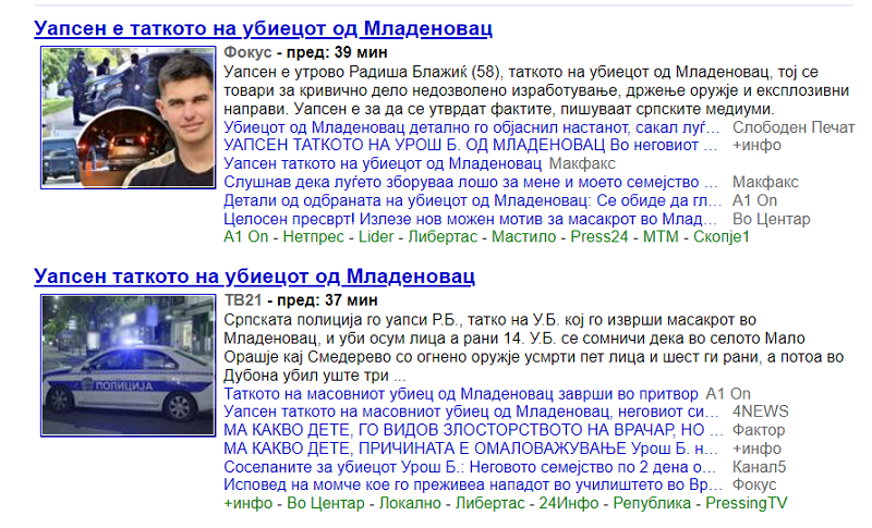 Главна вест денес се токму дел од македонските медиуми кои пред неколку дена објавија дека од срцев удар починал Радиша Блажиќ, таткото на убиецот од Младеновац, за да денеска истите тие да објават дека „е уапсен Радиша Блажиќ (58), таткото на убиецот Урош Блажиќ, кој е осомничен за убиство на осум лица“, бидејќи веста ја презеле непрофесионално и од некредибилни „жолти“ извори.