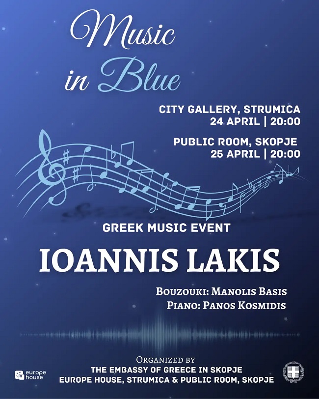 Амбасадата на Грција најавува два претстојни настапи во живо на грчкиот пејач Јоанис Лакис, кои ќе се одржат во Струмица во петок, на 24 април во 20:00 часот, во Градската галерија и во сабота, на 25 април, во 20:00 часот, во поткровјето на Public Room во Скопје.