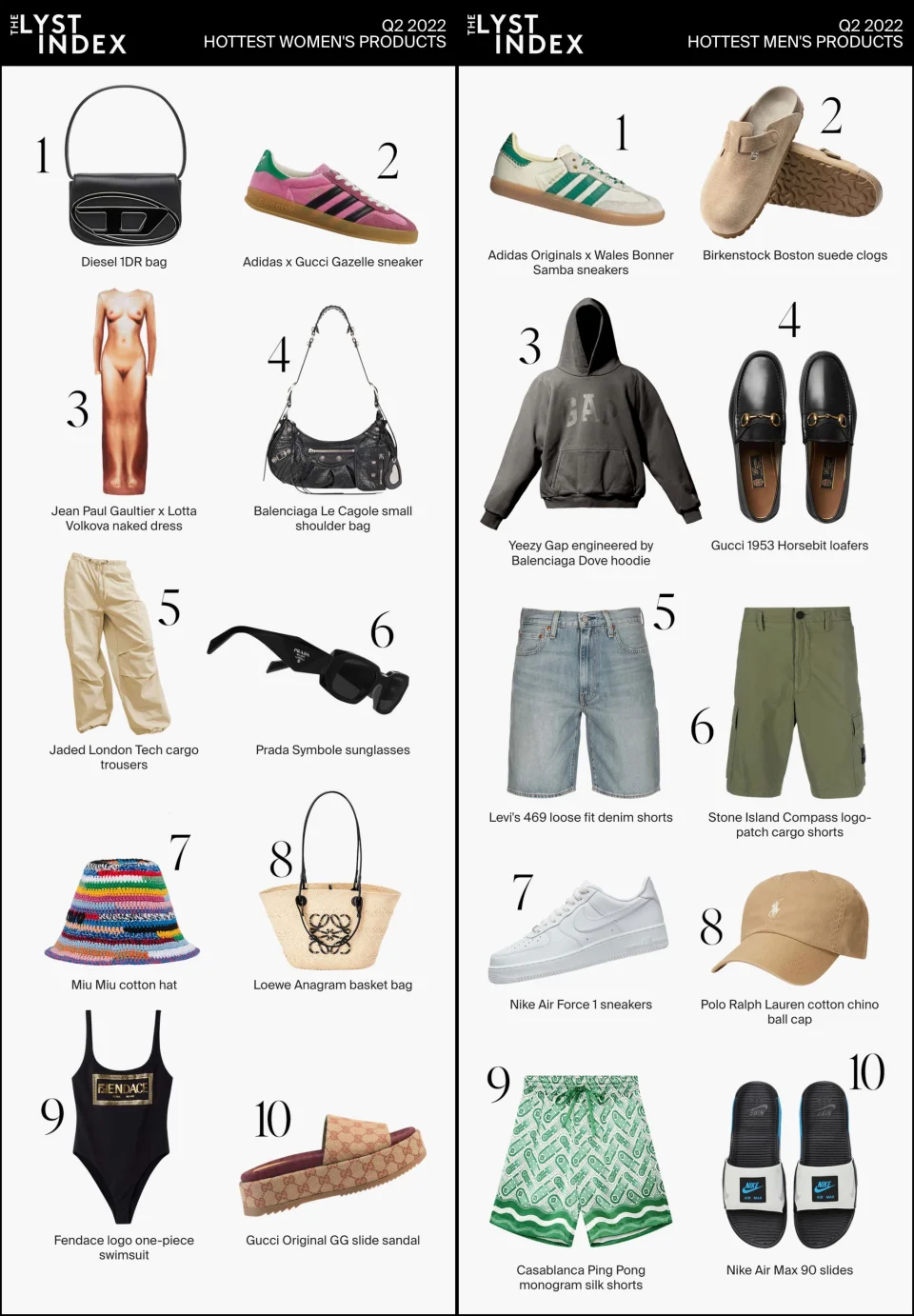 Чантата 1DR во форма на Y2K издадена под креативниот директор Глен Мартенс во Дизел беше најжешкиот женски производ овој квартал. Како што беше видено на Меган Ти Сталион, Џулија Фокс и Палома Елсесер, пребарувањата за моделот на Lyst скокнаа за 317 проценти во јуни. Генерално, побарувачката за слични стилски чанти на рамо се зголеми за 59 проценти во тој период.