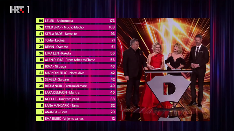Високо се пласираа и Стела Раде, на која ѝ беа доделени 12 поени од жиријата од Риека и Загреб, и Колд Снеп со 12 поени од жирито од Осиек. Жирито од Обединетото Кралство го додели максималниот број поени на пејачката Ноел.