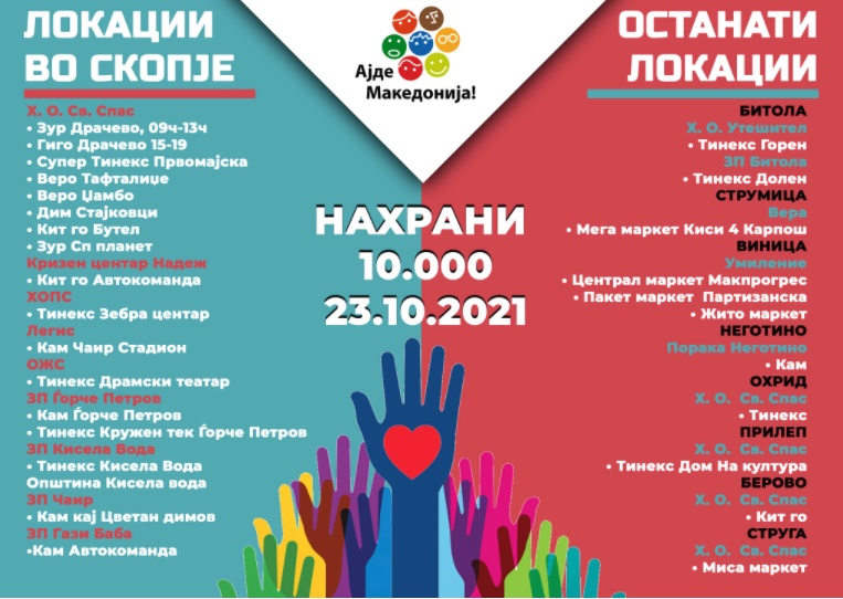 Голем број граѓански организации од целата држава на иницијатива на „Ајде Македонија“ денеска од 10 до 18 часот ќе спроведат национална хуманитарна акција „Нахрани 10.000“ за собирање храна. Станува збор за национална акција за донирање храна на одбрани локации и нејзино дистрибуирање до социјално загрозени граѓани.