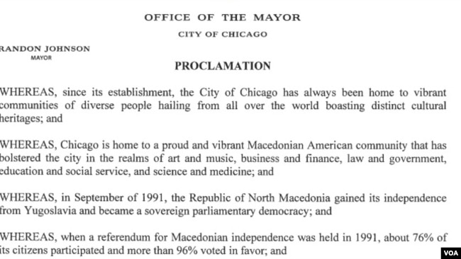 „Чикаго е дом на горда и динамична македонско-американска заедница која го зацврсти градот во делот на уметноста и музиката, бизнисот и финансиите, правото и владата, образованието, социјалните услуги, науката и медицината“, рече градоначалникот Џонсон во известувањето.