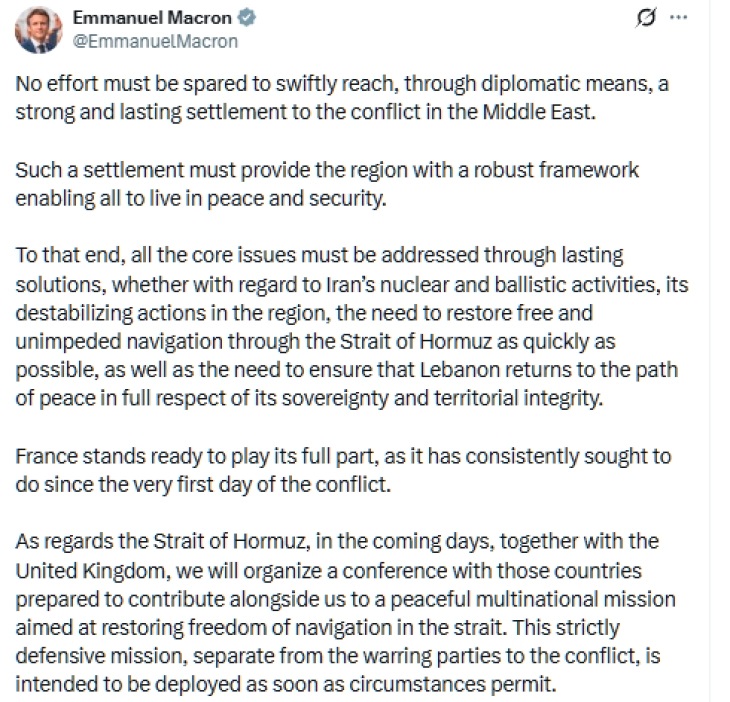 Францускиот претседател Емануел Макрон во најава на платформата X изјави дека земјата ќе организира конференција со Велика Британија и други држави за создавање мултинационална мисија за враќање на пловидбата во тој дел од светот.