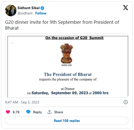 На поканата, напишана на англиски јазик, стои дека ја упатува „претседателот на Барат“, а не претседателот на Индија. Претходно на ваквите покани секогаш стоело Индија.