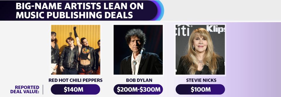 Боб Дилан минатата година продаде над 600 авторски права на Universal Music Group во зделка, наводно, проценета на над 300 милиони долари. Пред тоа, Стиви Никс го продаде мнозинскиот удел во нејзиното пишување песни за пријавени 100 милиони долари.