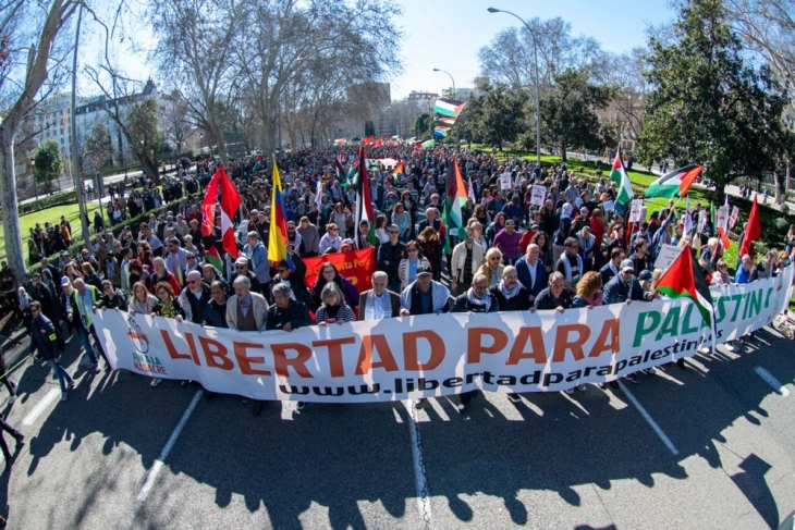Демонстрантите поминаа од железничката станица до главниот плоштад во центарот на Мадрид, носејќи голем транспарент на кој пишуваше „Слобода за Палестина“.