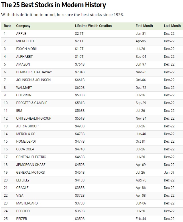 Списокот исто така покажува како моделите на создавање богатство се менувале со текот на времето. Додека главните производи за енергија и потрошувачи се почести меѓу постарите компании во рангирањето, акциите што создадоа огромни богатства во последниве години се технолошките или финансиските компании.