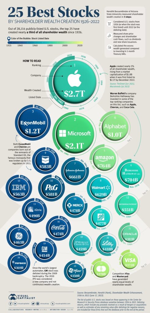 Следниот инфографик користи податоци од Хенрик Бесембиндер од Државниот универзитет во Аризона за да ги прикаже најдобрите акции од минатиот век.