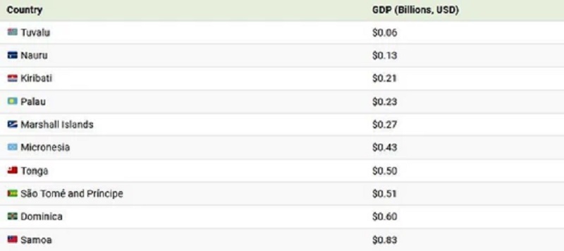 Тувалу има најнизок БДП од која било земја од само 64 милиони долари. Тувалу е една од десетте земји со БДП помал од една милијарда долари.