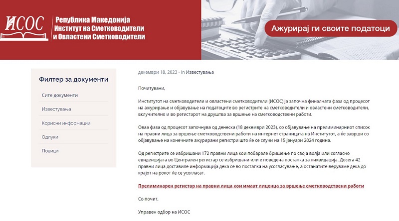 ИСОС го закружува процесот на ажурирање и објавување на регистрите на професионални сметководители