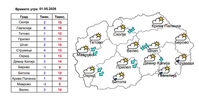 Температурите ќе се движат од -3 степени Целзиусови на Маврово и -1 во Берово, наутро, до 15 степени во Скопје, односно 16 во Гевгелија.