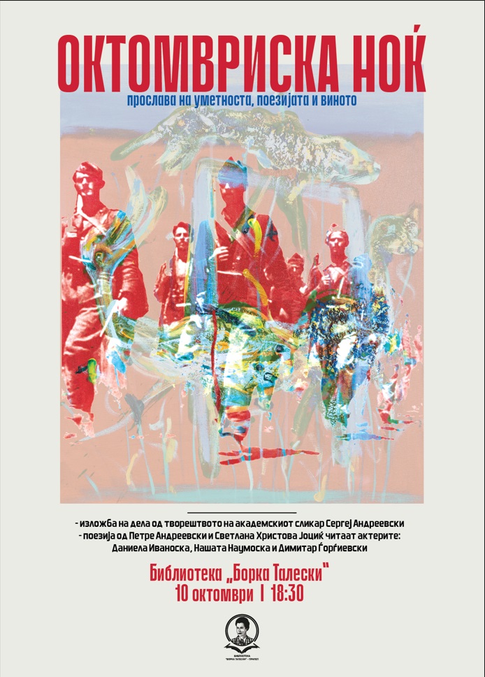 Во пресрет на „11 Октомври“, еден од најголемите национални празници, во градската библиотека „Борка Талески“ во Прилеп, ќе биде отворена поставка на дела од академскиот сликар Сергеј Андреевски. Во рамките на настанот што ќе се одржи на 10 октомври со почеток во 18:30 часот со наслов Октомвриска вечер: Прослава на уметноста, поезијата и виното, реномирани актери ќе читаат поезија од Петре М. Андреевски и Светлана Христова – Јоциќ.