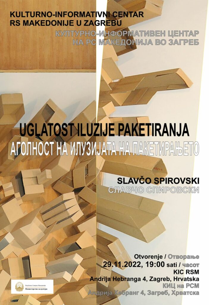 Во македонскиот Културно-информативен центар во Загреб синоќа беше отворена самостојната изложба „Аголност на илузијата на пакетирањето“ на скулпторот Славчо Спировски, информира Здружението за култура и уметност „КултурОп“.