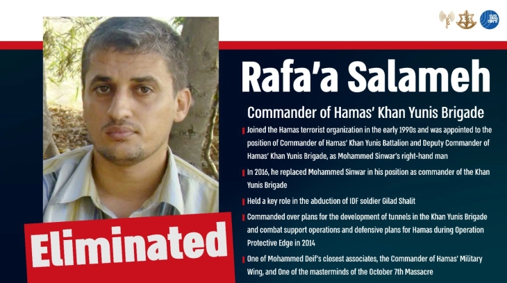 Израел вчера соопшти Рафа Салама, висок командант на палестинската исламистичка група Хамас, бил убиен во воздушен напад за кој здравствените власти во Газа рекоа дека погодил бегалски камп и во кој загинале најмалку 90 луѓе.