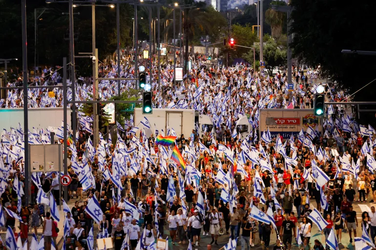 Демонстрантите со израелски знамиња се собраа во Тел Авив оваа сабота по 30-ти пат по ред. Израелските медиуми објавија дека има повеќе од 170.000 демонстранти во тој град, кој се смета за епицентар на протестите, а околу 200.000 низ Израел. „Ние сè уште ја сакаме оваа земја и се обидуваме да ги решиме проблемите“, изјави еден од демонстрантите за АФП.