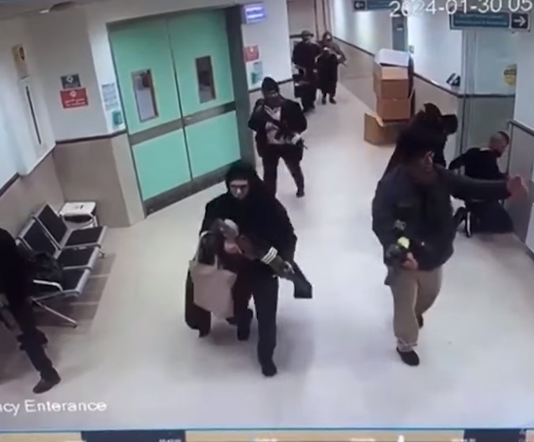 Видеото од безбедносната камера од болницата што кружеше на социјалните мрежи покажува десетина тајни агенти, повеќето вооружени, облечени како жени со муслимански шамии или болнички персонал во пилинг или бели лекарски мантили. Еден со хируршка маска носел пушка во едната рака и преклопена инвалидска количка во другата. Силите беа видени како тапкаат по еден маж кој клекнал до ѕид, со кренати раце.
